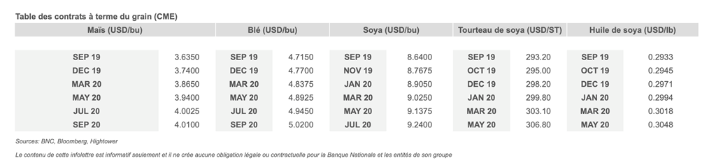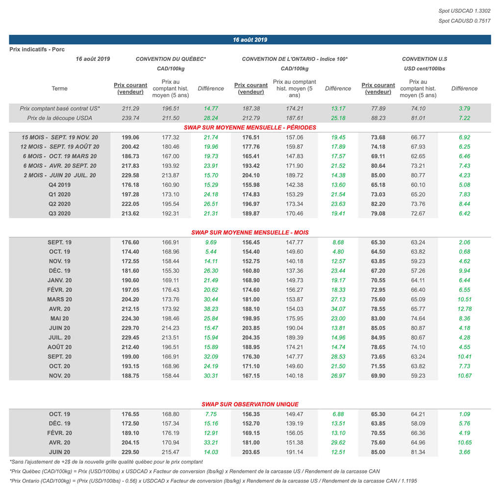 • Les contrats de porc (CME) ont transigé à la baisse hier. Le contrat d’octobre a notamment enregistré de fortes pertes, son prix diminuant de 2.7% hier.