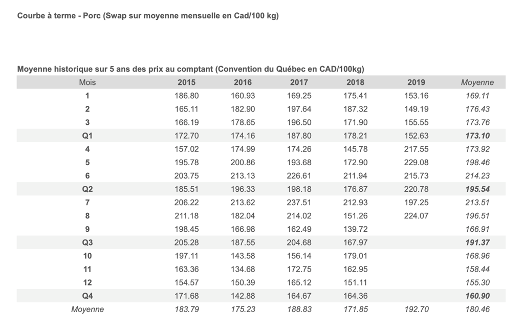 Voici les prix les plus récents sur le marché du porc et des grains: