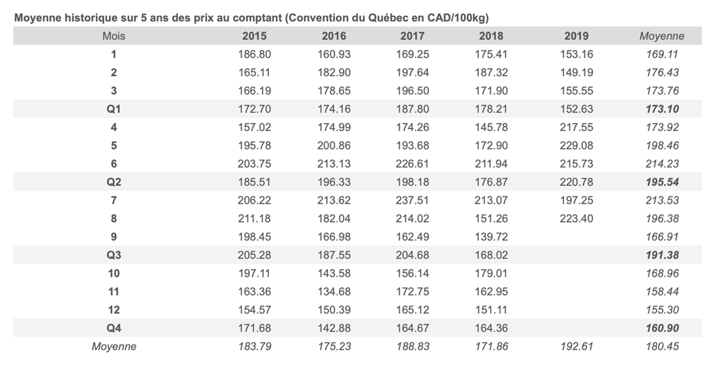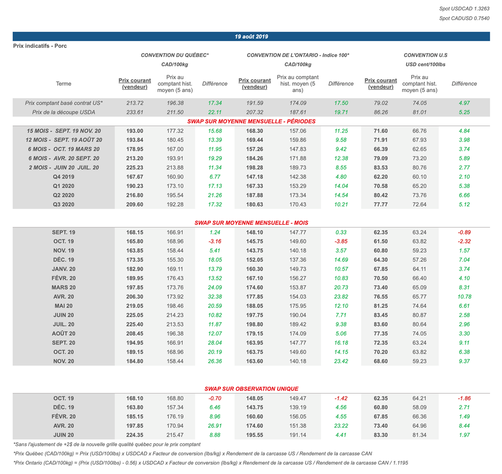 • Les contrats de porc (CME) ont enregistré de fortes pertes journalières vendredi dernier. Le contrat actif a notamment subi une baisse de 4.6% vendredi, atteignant un creux jamais vu depuis juillet 2018.