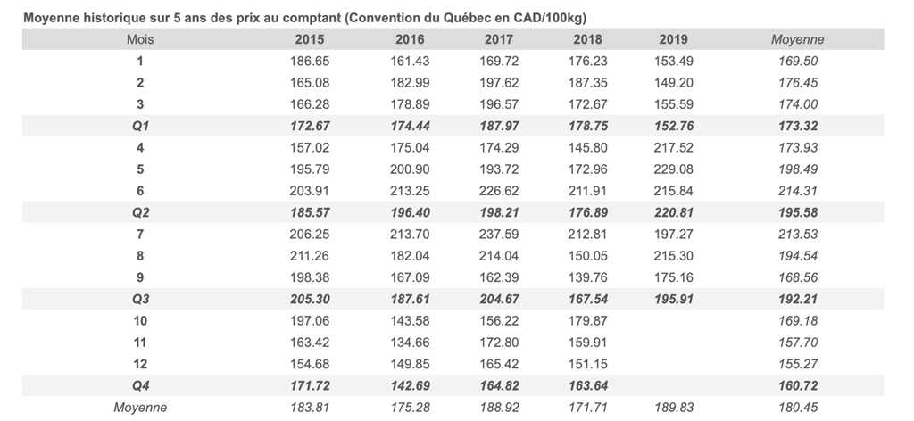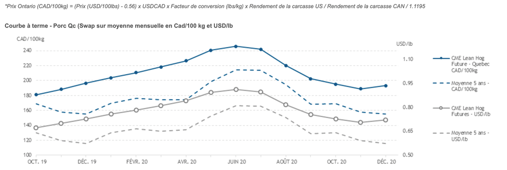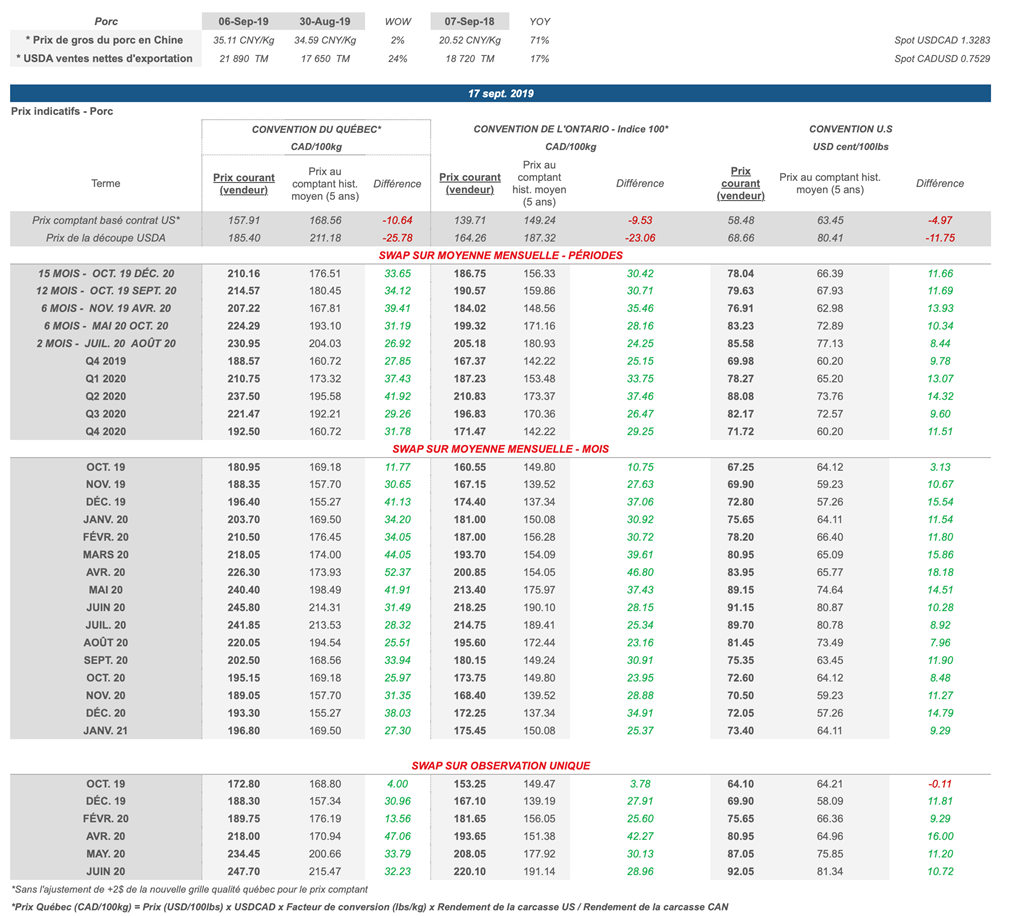 Voici les prix les plus récents sur le marché du porc et des grains: