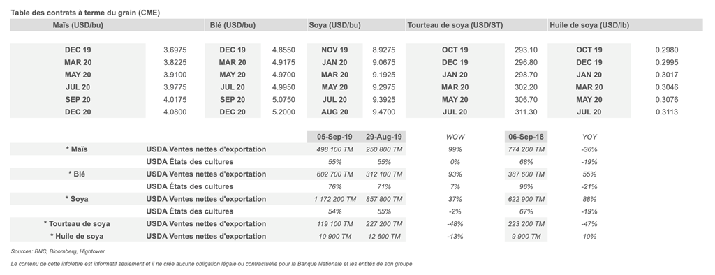 •Le maïs et le soya sont en baisse après que l'USDA a signalé de meilleures conditions de récolte aux États-Unis dans un rapport hebdomadaire lundi après la clôture. Les conditions définies par l'USDA dans l'Indice pondéré de l'état des cultures Pro Farmer ont montré que le maïs avait progressé de 1,2 point à 348,3, tandis que la récolte de soja progressait de 0,6 point.
