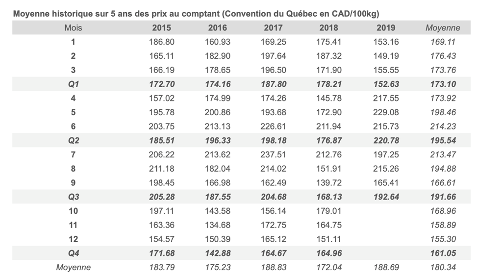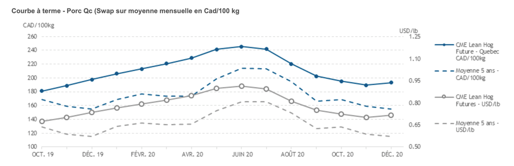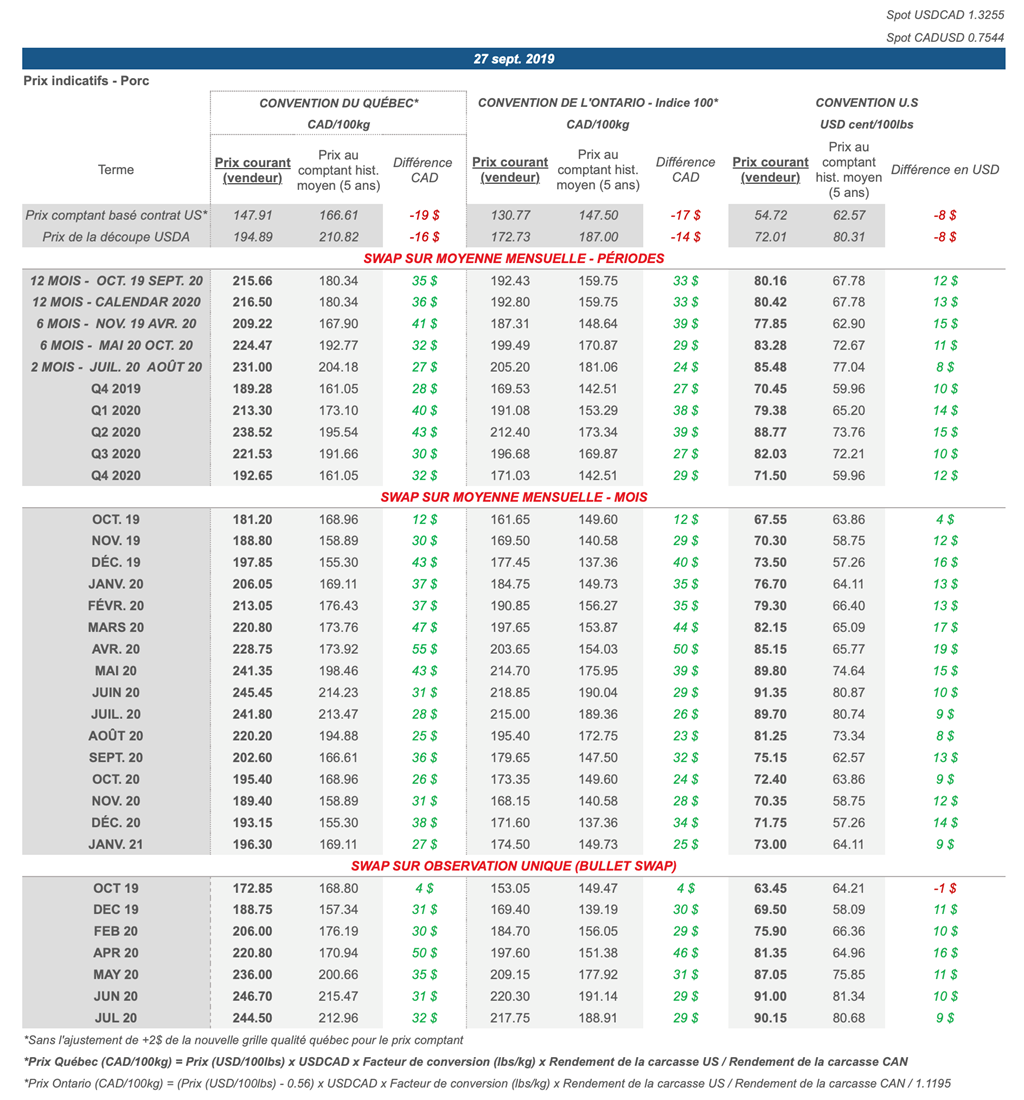 Voici les prix les plus récents sur le marché du porc et des grains:
