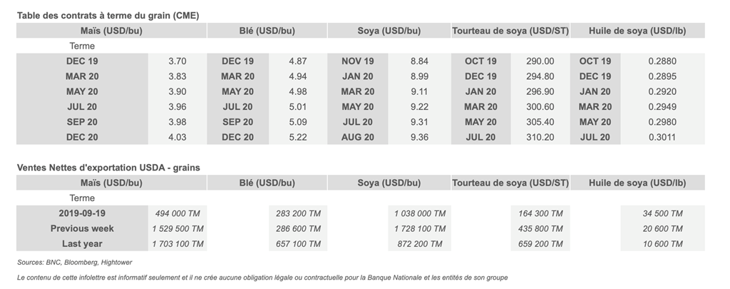 • Lundi prochain, le rapport trimestriel des inventaires du USDA sera publié. Les attentes penchent vers des inventaires de grains US en hausse, éclipsant l'optimisme d'un éventuel accord commercial entre les États-Unis et la Chine.