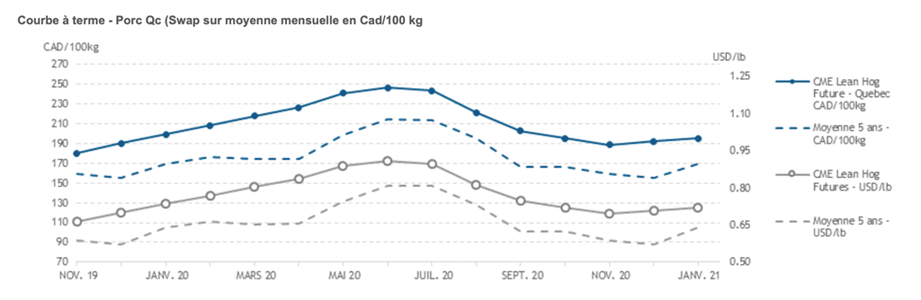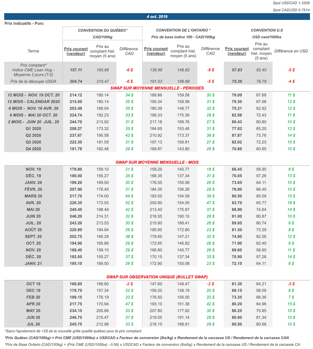•Au 1er octobre, l'indice de référence au comptant CME Lean Hog (IHX) était de 57,83 USD/100 lbs, en hausse de 0,78 par rapport à la session précédente et de 54,67 la semaine précédente.