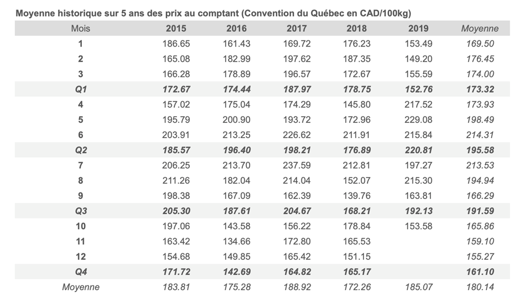 Voici les prix les plus récents sur le marché du porc et des grains:
