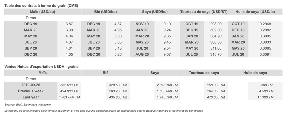 • L'administration Trump annoncera vendredi des projets d'aide en faveur de l'éthanol à base de maïs et du biodiesel à base de soya. Les inventaires d’huile de palme en Malaisie, le deuxième producteur en importance au monde, ont augmenté à leur rythme le plus rapide depuis presque un an en septembre, alors que les exportations chutaient et que la production augmentait.