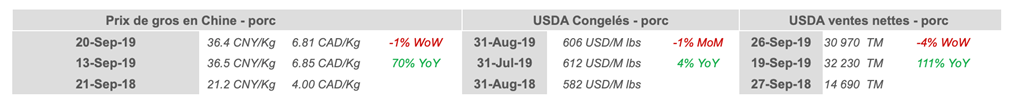 • Les contrats à terme de porcs CME étaient en baisse hier et certains ont touché leur limite maximum, diminuant pour une 5e journée consécutive, alors que l'abattage de porc aux États-Unis est élevé et les incertitudes entourant les négociations commerciales américaines de cette semaine avec la Chine se font sentir.