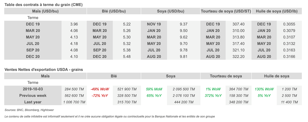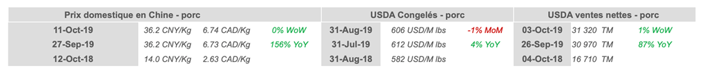 • Le gouvernement chinois affirmerait que leur inventaire de porcs devraient grimper graduellement et prévoirait que leur offre revienne à la normale en 2020. Le Vietman envoie un message rassurant également, mentionnant que le nombre de porcs infectés et abbatus a significativement diminué.