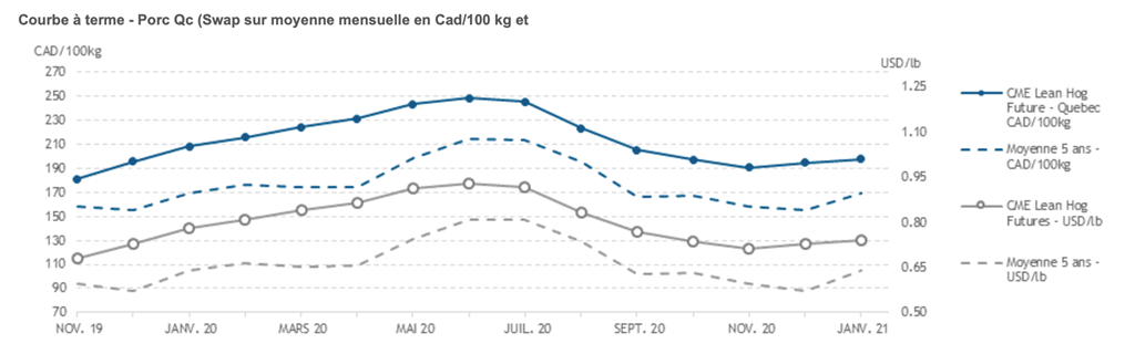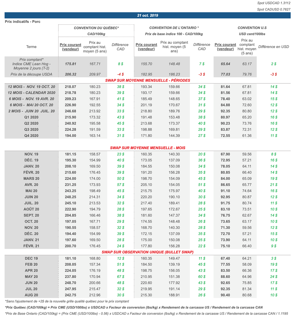 Voici les prix les plus récents sur le marché du porc et des grains: