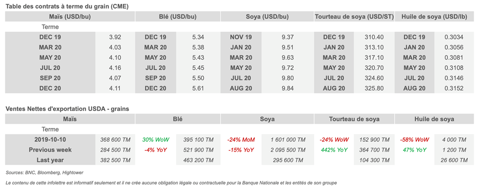 • La récolte de maïs et de soya aux États-Unis continue de prendre du retard par rapport à la normale en raison des précipitations dans certaines parties du Midwest, créant une perte potentielle de qualité des cultures.