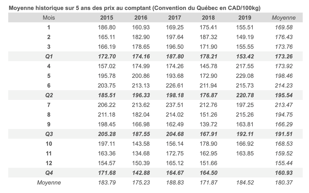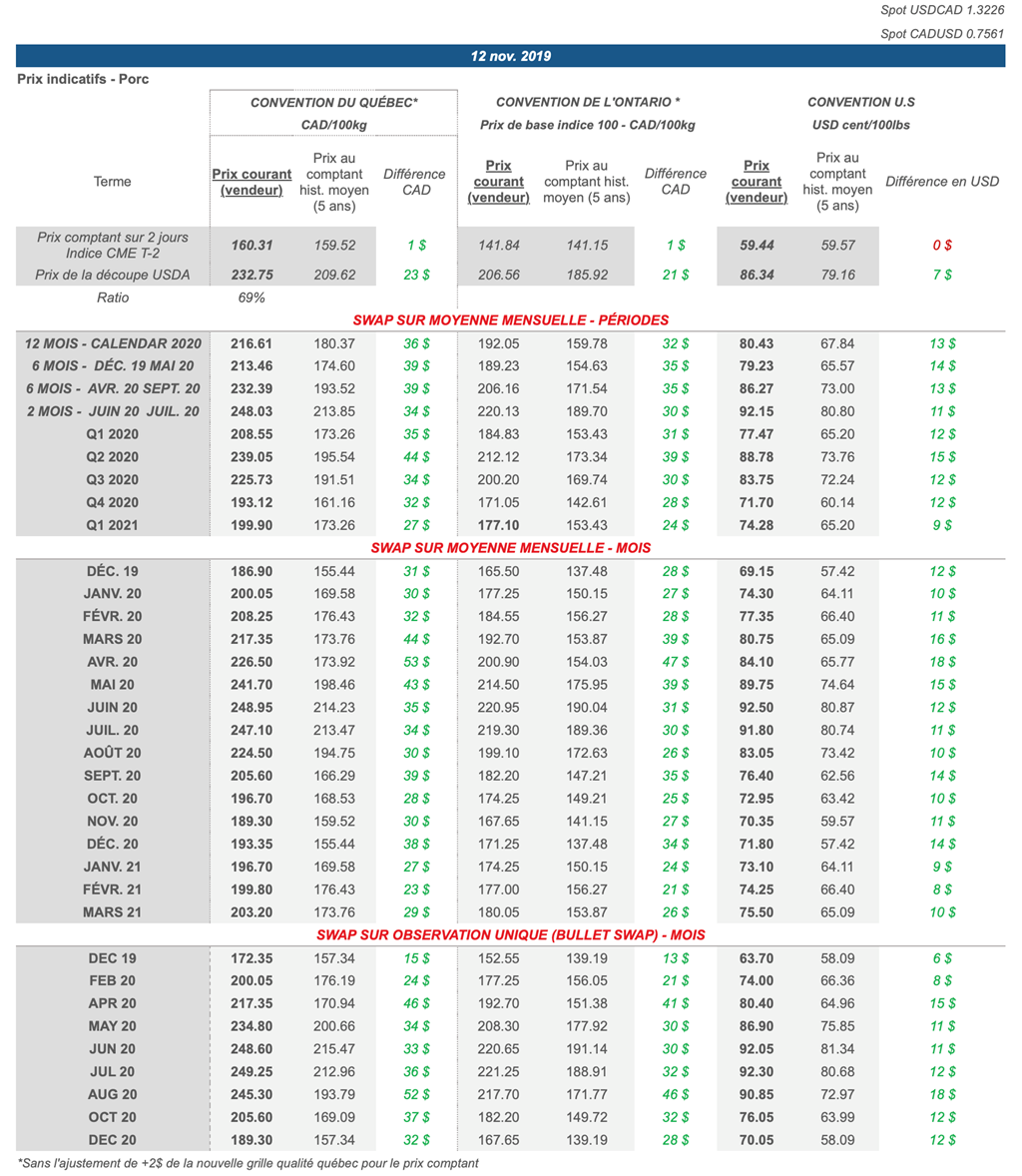 Voici les prix les plus récents sur le marché du porc et des grains: