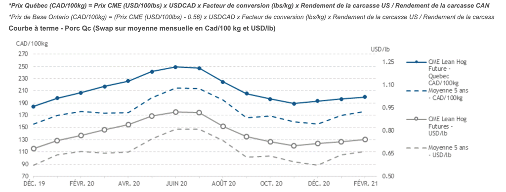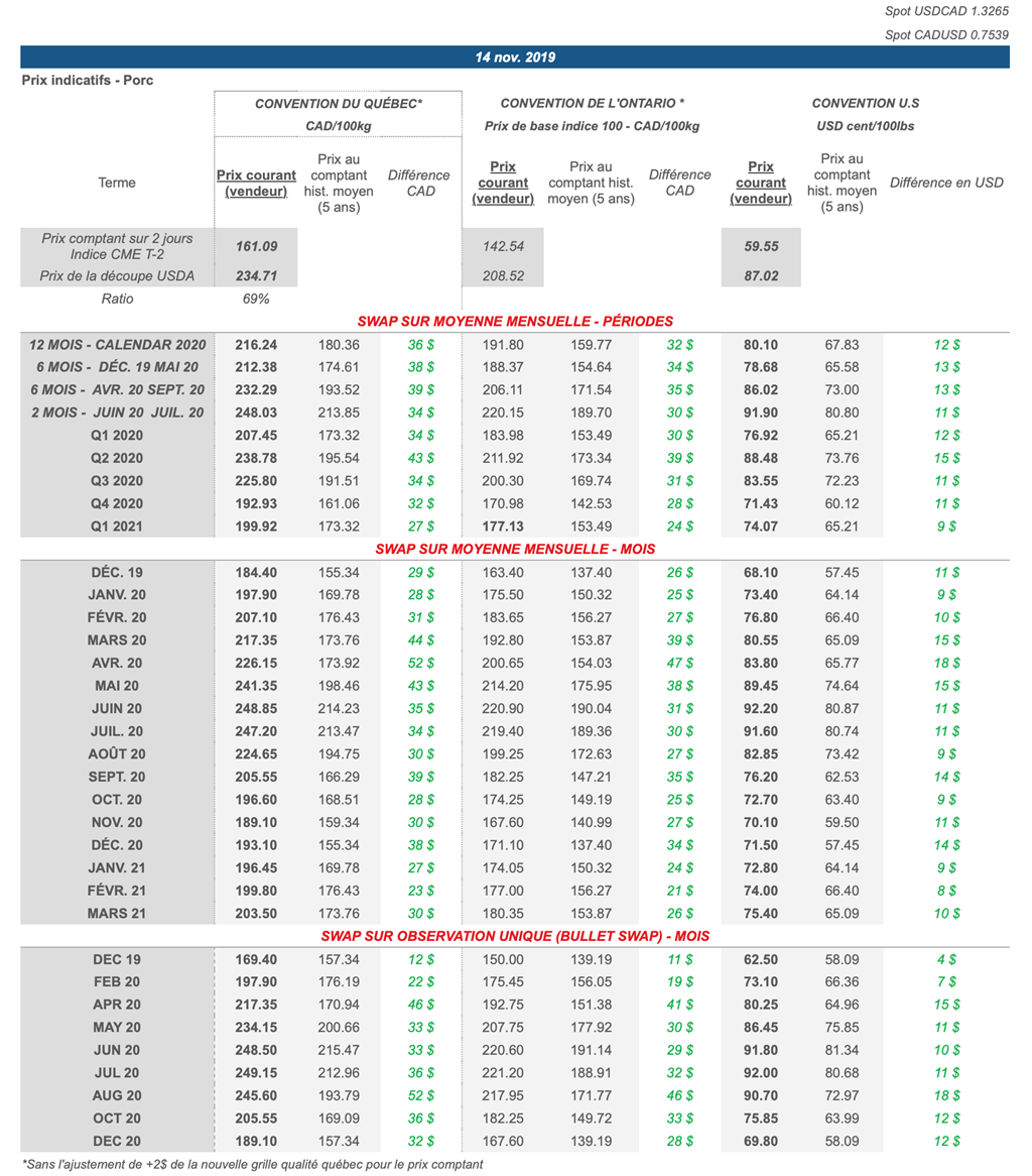 Voici les prix les plus récents sur le marché du porc et des grains: