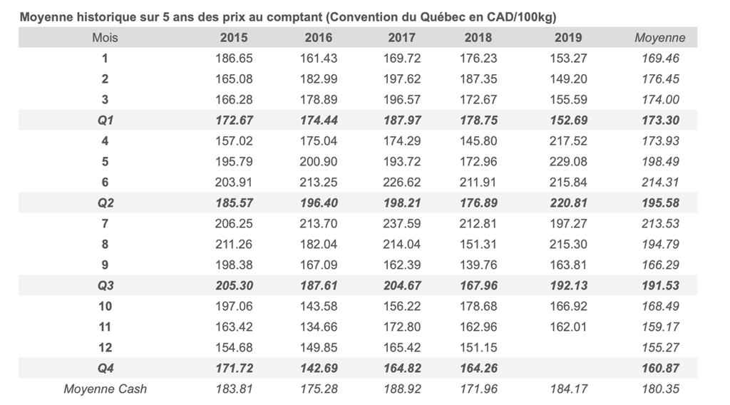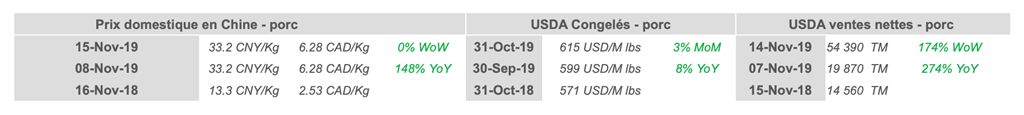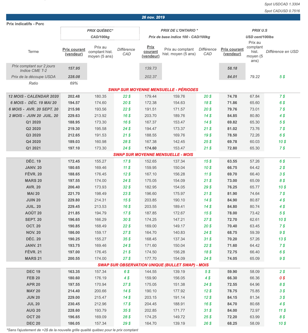Voici les prix les plus récents sur le marché du porc et des grains: