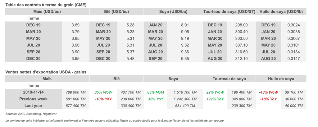 • Les contrats à terme de soya se sont stabilisés à leur plus bas niveau en deux mois, les traders pesant l'amélioration des conditions météorologiques au Brésil et sur les perspectives d'un accord commercial entre les États-Unis et la Chine. Des précipitations ont été enregistrées dans le centre du Brésil au cours du week-end et les prévisions annoncent des pluies plus abondantes dans les prochains jours, ce qui devrait atténuer le stress des cultures en cours de plantation. Les contrats à terme sont restés sous pression, même si les exportateurs américains ont chargé le plus de fèves en presque deux ans et que la Chine a indiqué qu'elle progressait dans la voie d'un accord commercial.