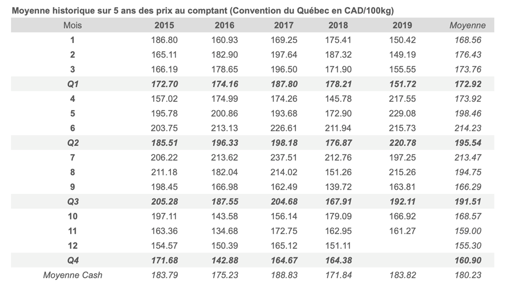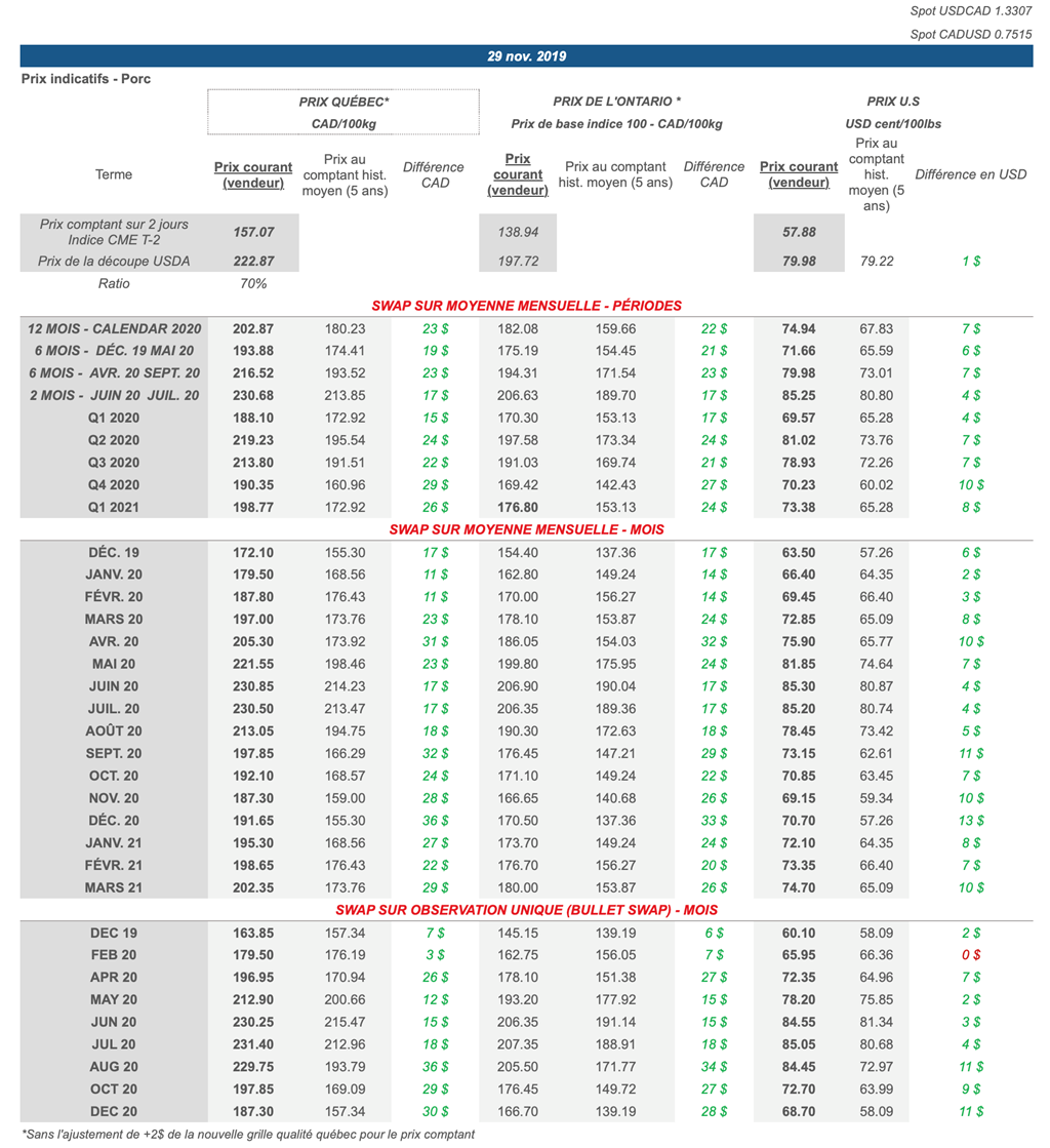 Voici les prix les plus récents sur le marché du porc et des grains: