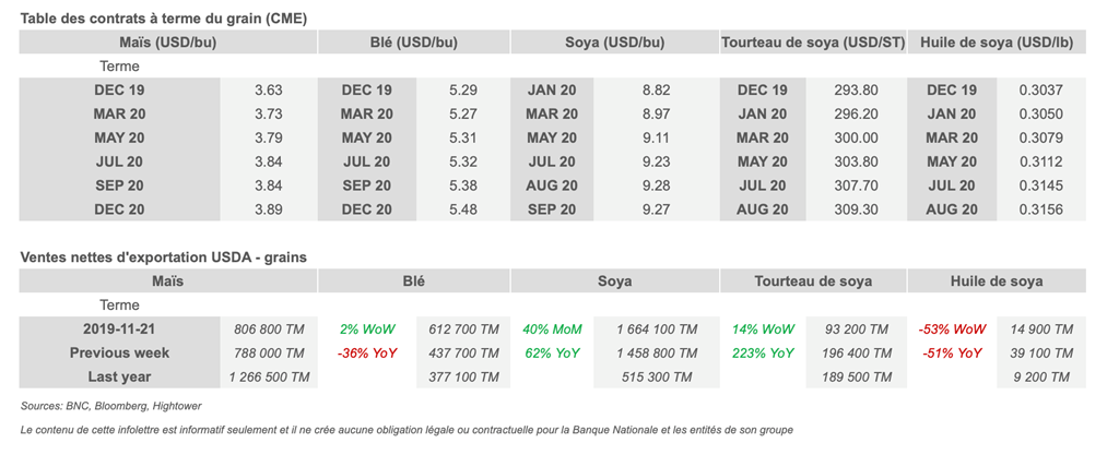 • L'USDA publie rapport sur les ventes nettes à l'exportation pour la semaine se terminant le 21 novembre.