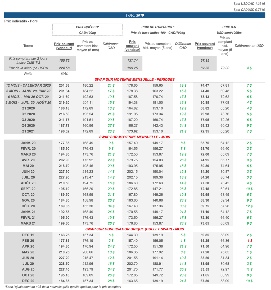 Voici les prix les plus récents sur le marché du porc et des grains: