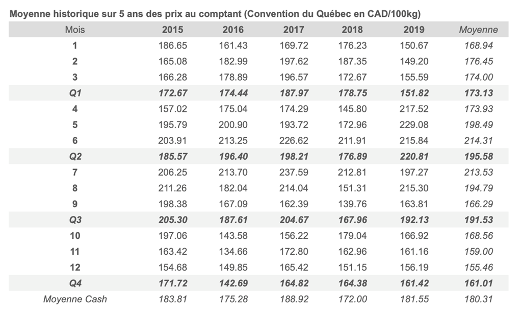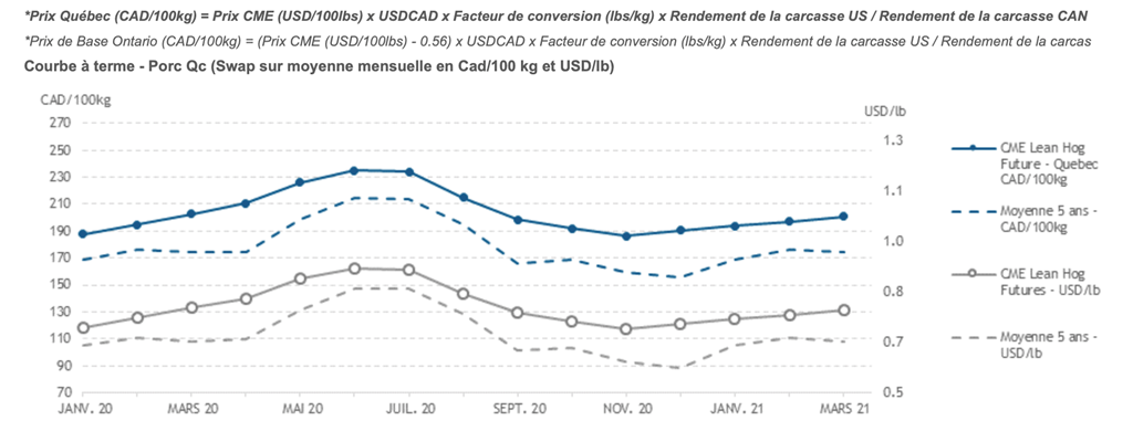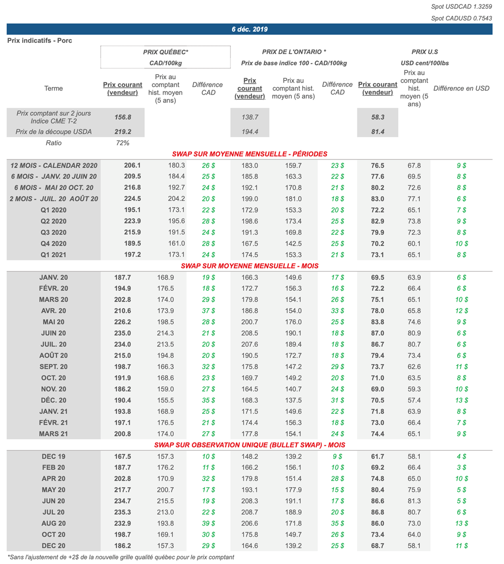 Voici les prix les plus récents sur le marché du porc et des grains: