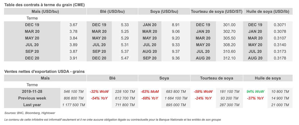 • Mise à jour commerciale: La Chine aurait déclaré lors des pourparlers vendredi qu'elle retirait les droits de douane sur le soya et le porc importés des États-Unis pour conclure la première phase d'un accord visant à désamorcer une guerre commerciale en cours entre les deux plus grandes économies.