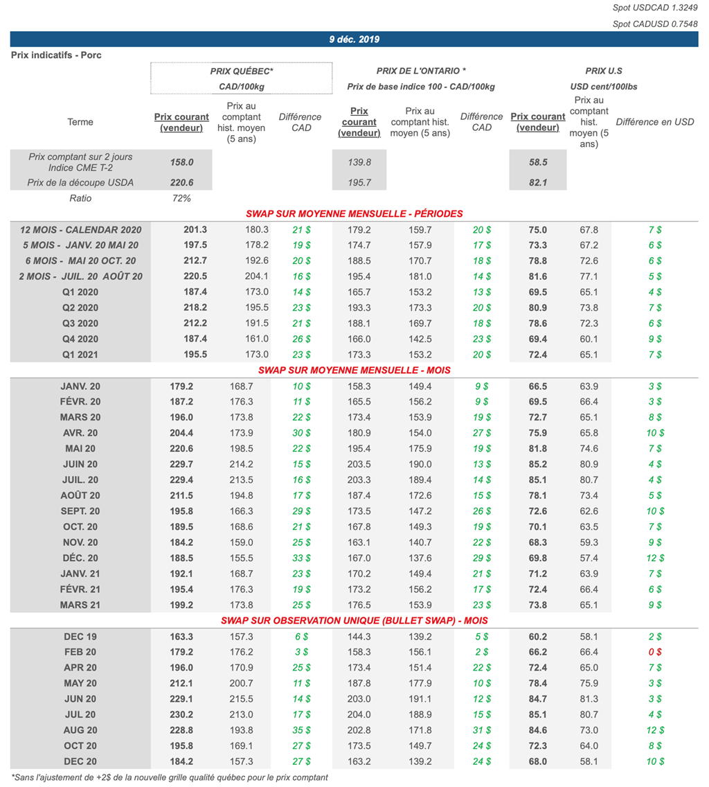 • Le prix cash du porc gagne à nouveau cette semaine et s'est établit à 58,49 USD/lb ce jeudi, récupérant lentement du creux du 1er décembre.