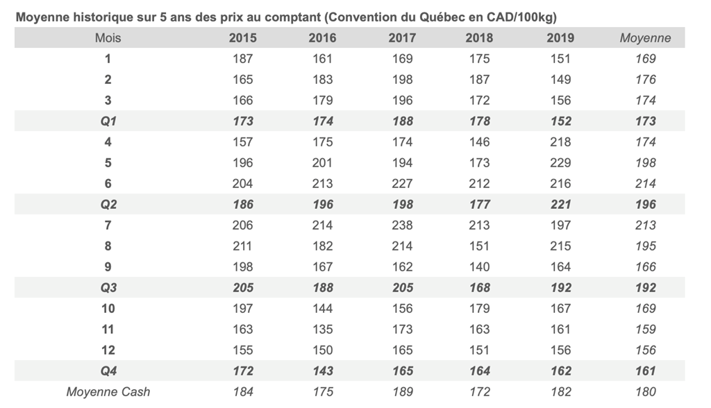 Voici les prix les plus récents sur le marché du porc et des grains: