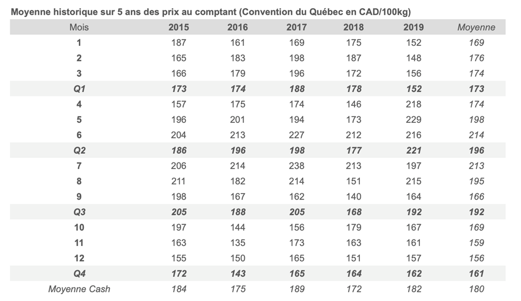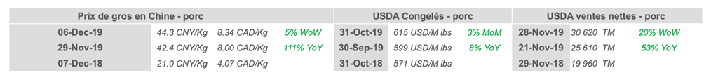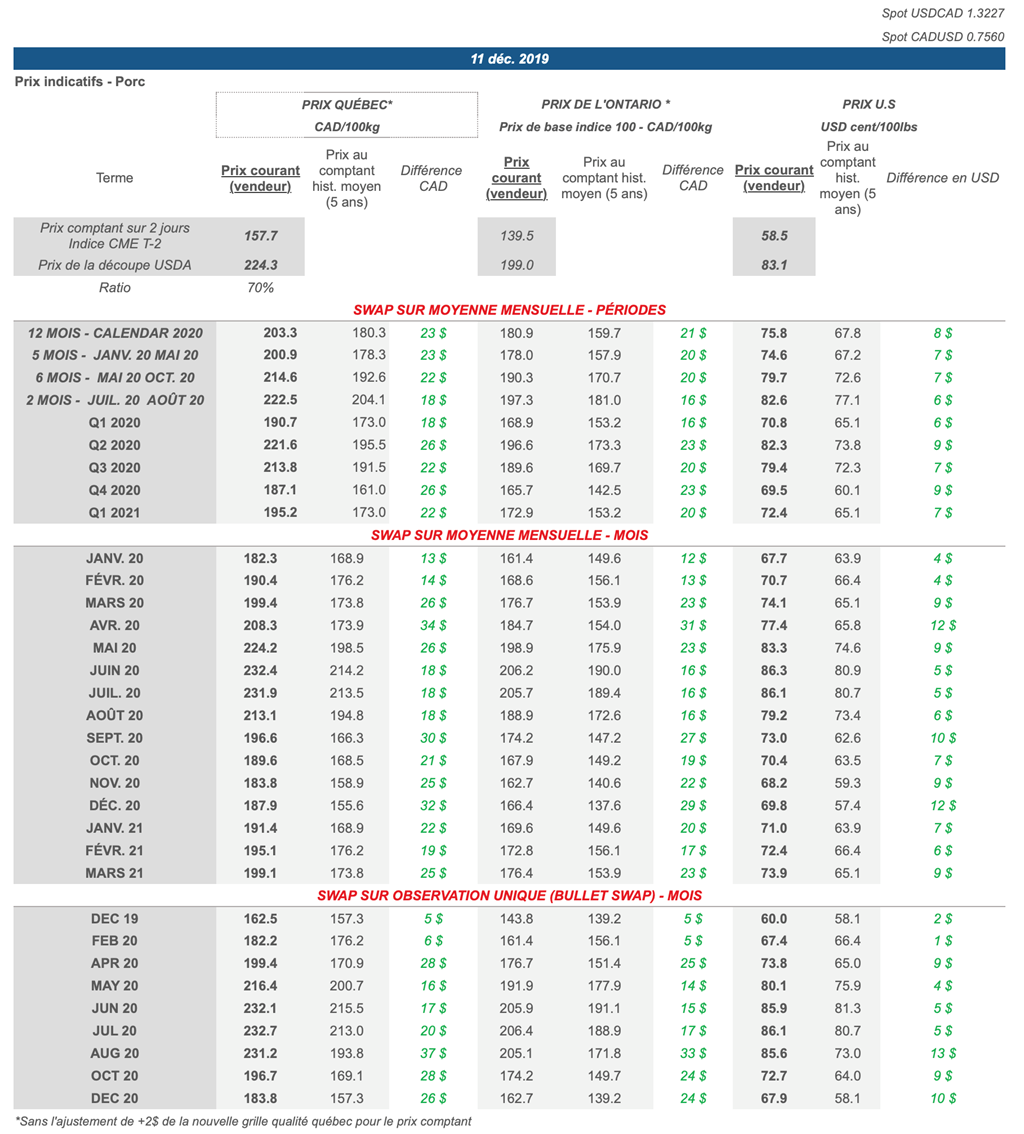 Voici les prix les plus récents sur le marché du porc et des grains: