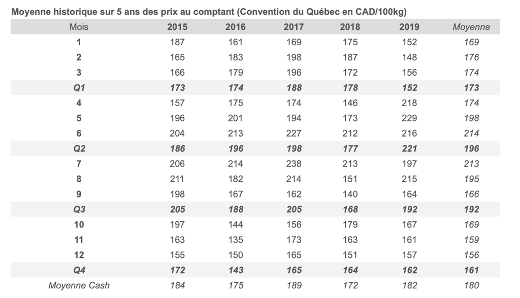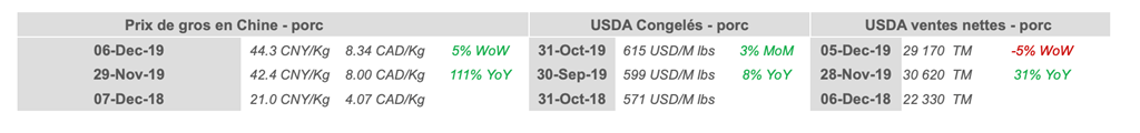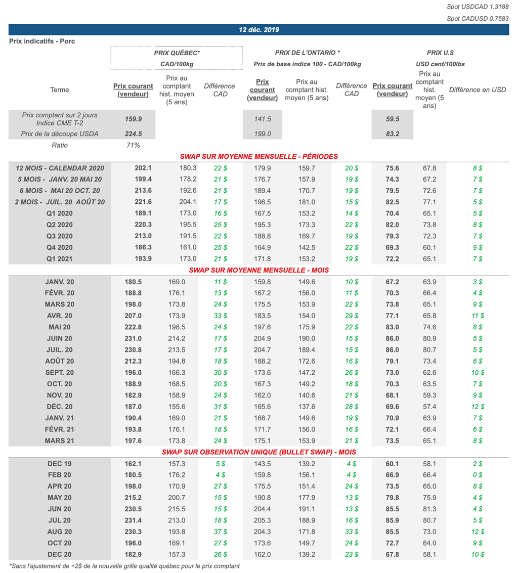 Voici les prix les plus récents sur le marché du porc et des grains: