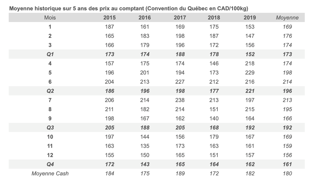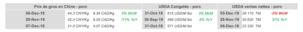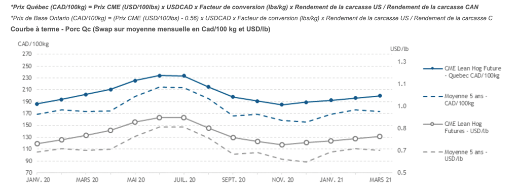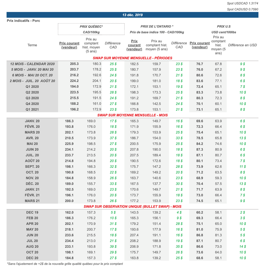 Voici les prix les plus récents sur le marché du porc et des grains: