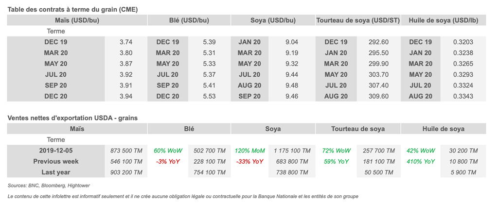 • Les prix du maïs et du soya rallient sur l'optimisme de l'accord commercial. Trump a tweeté hier étant très proche de parvenir à un accord.