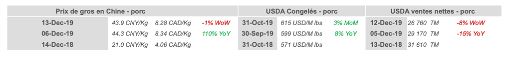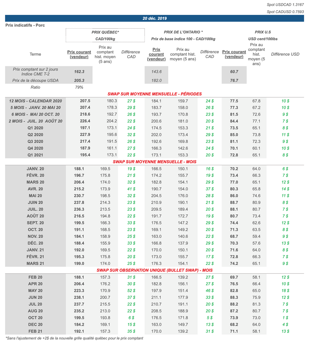 Voici les prix les plus récents sur le marché du porc et des grains: