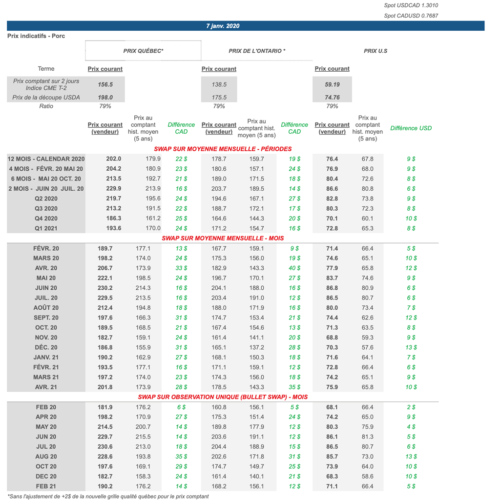 Voici les prix les plus récents sur le marché du porc et des grains: