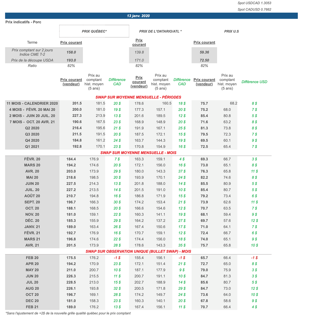 Voici les prix les plus récents sur le marché du porc et des grains: