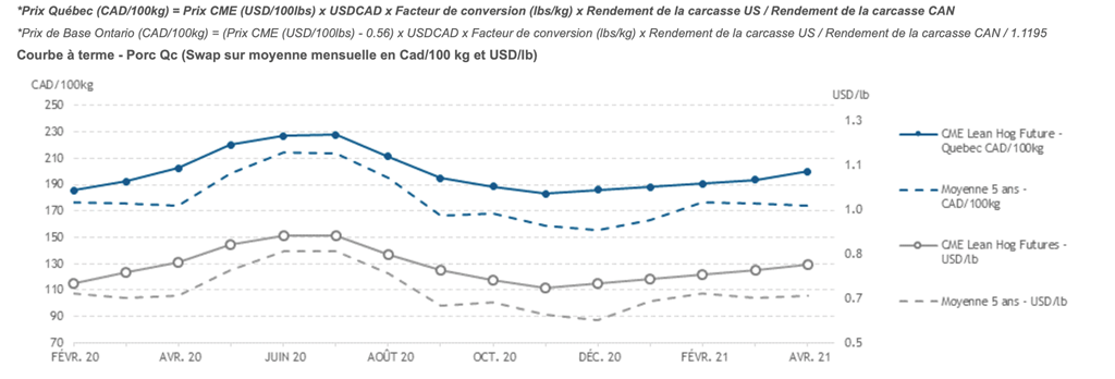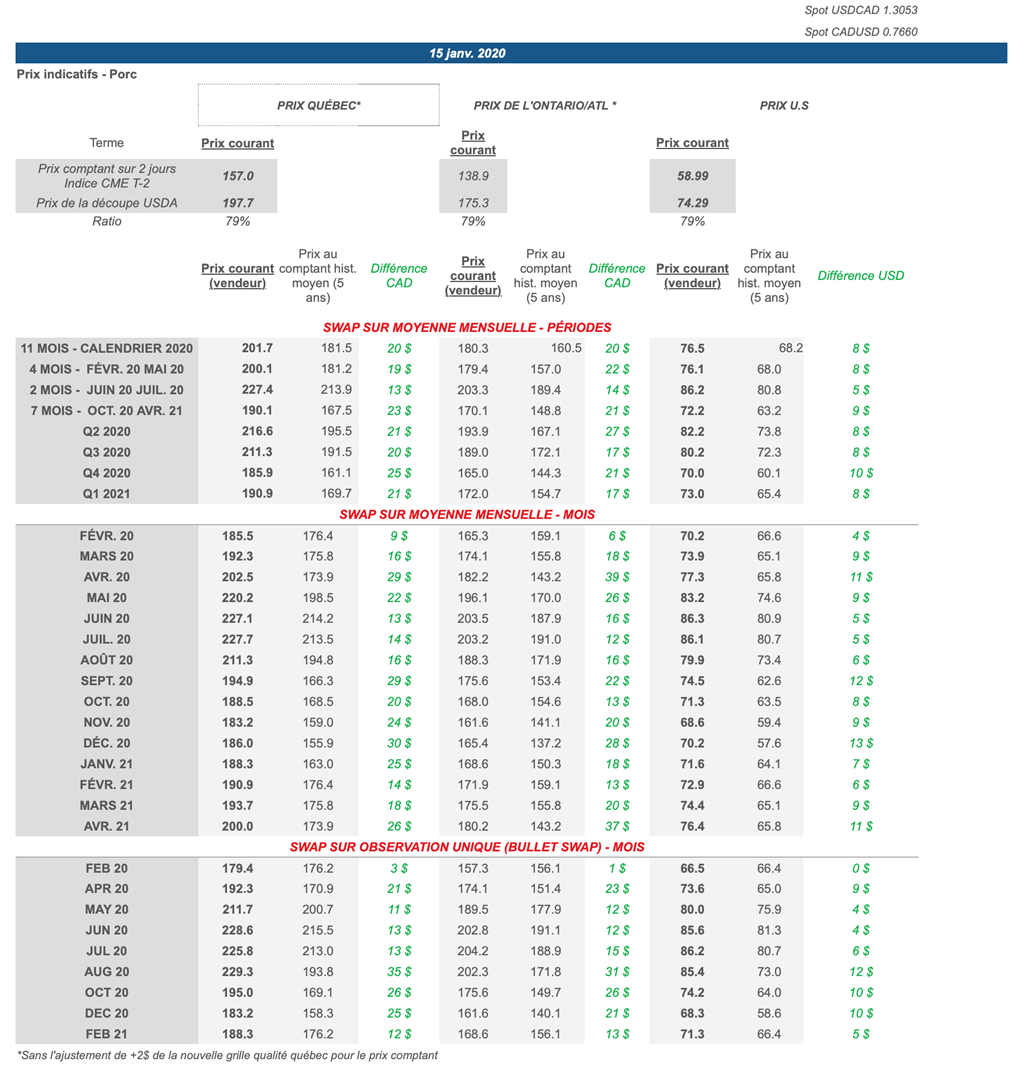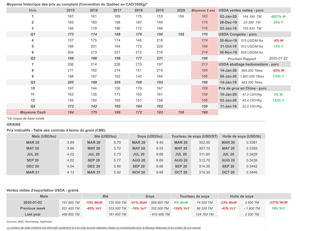 Voici les prix les plus récents sur le marché du porc et des grains: