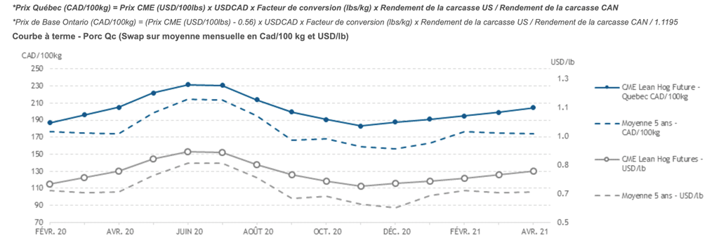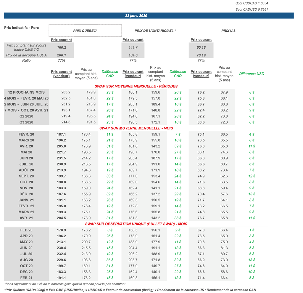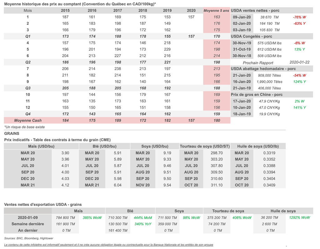 Voici les prix les plus récents sur le marché du porc et des grains: