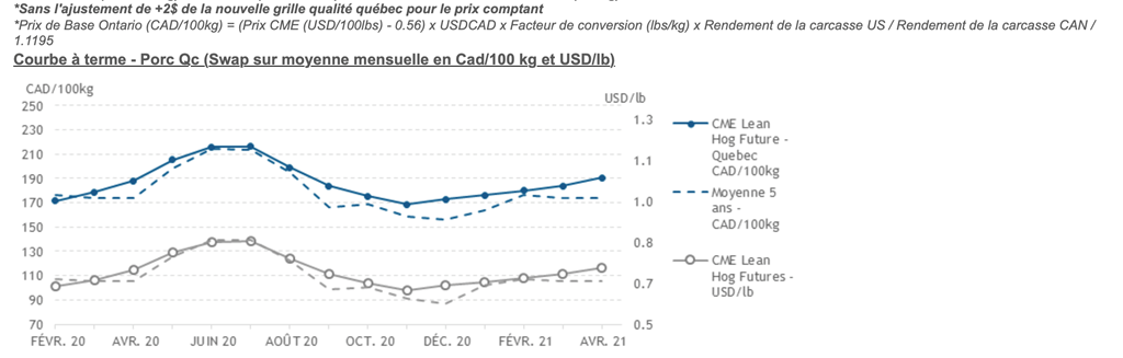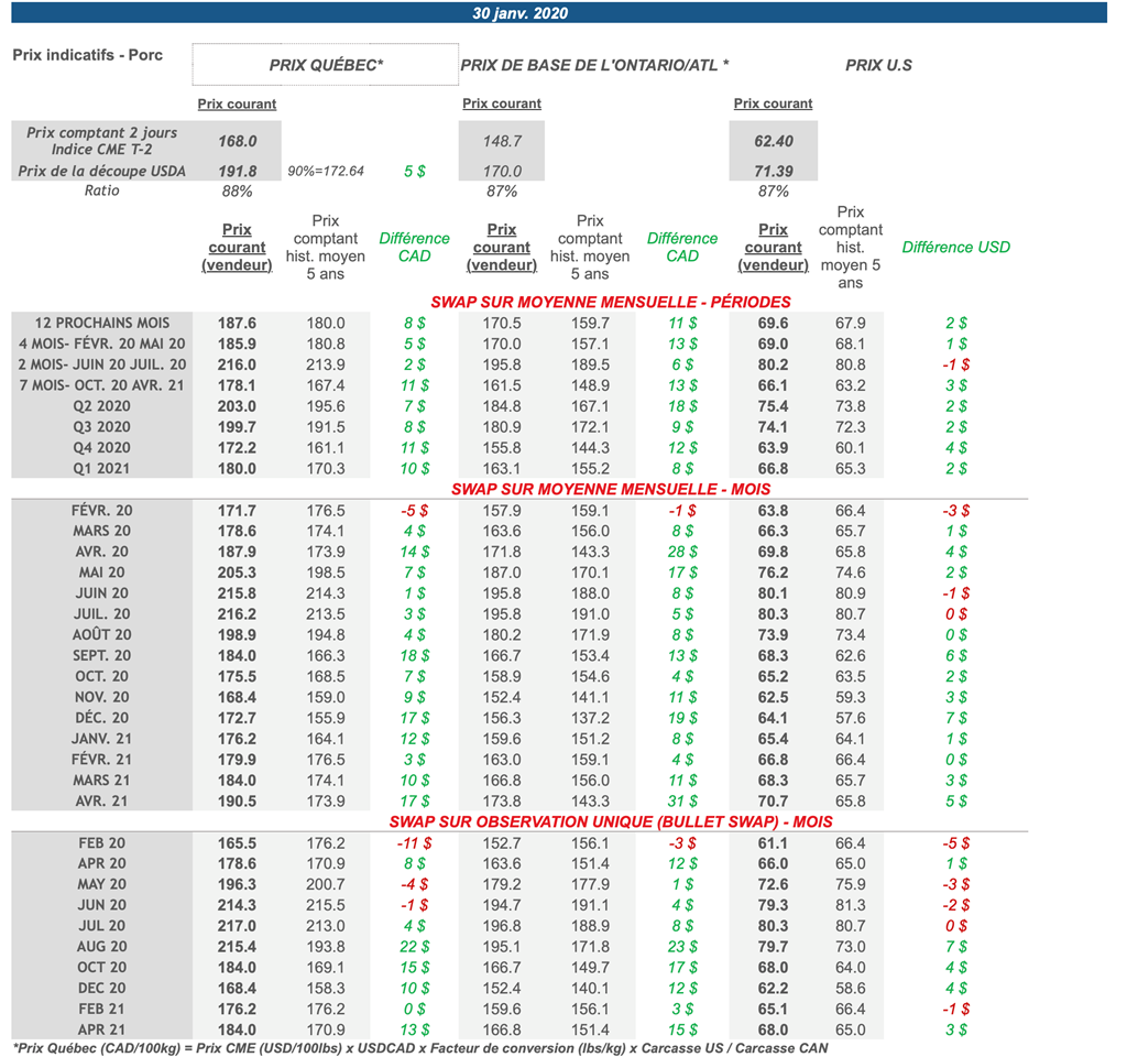 Voici les prix les plus récents sur le marché du porc et des grains:
