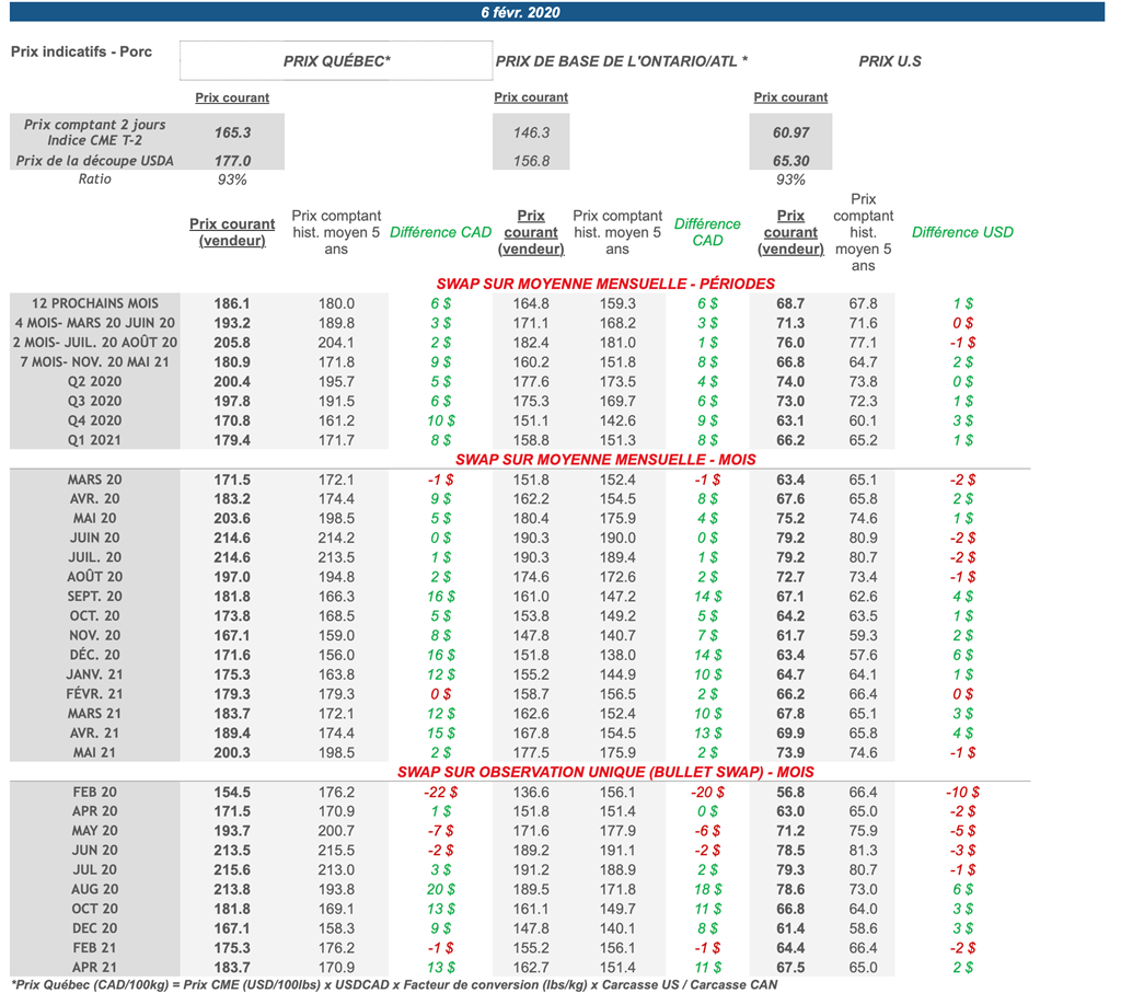 • Les prix des contrats de porcs ont légèrement baissé hier avec le plus grans recul à 0,60 USD/lb sur mai-2020, à l'exception de février qui a augmenté de +0,35 USD cents/lb.
