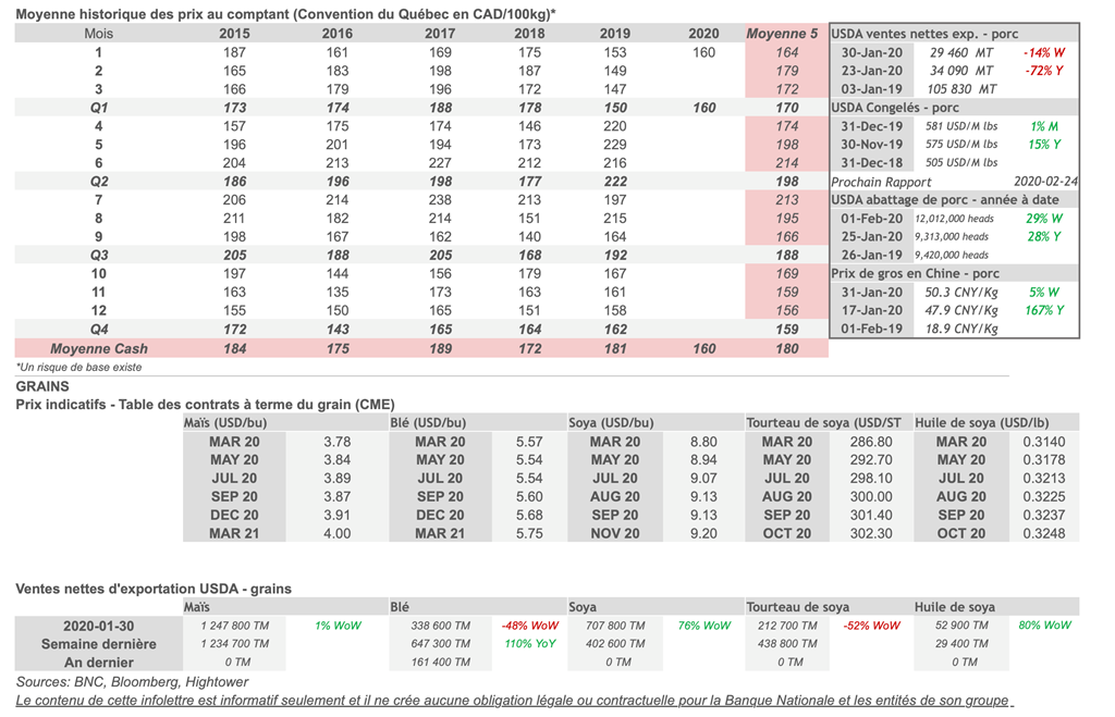 Voici les prix les plus récents sur le marché du porc et des grains: