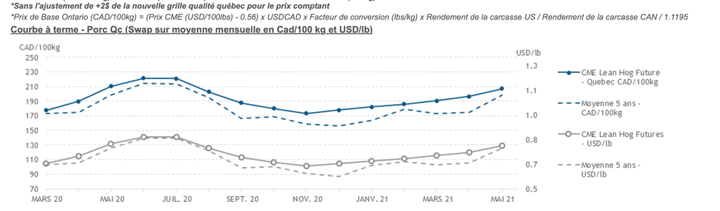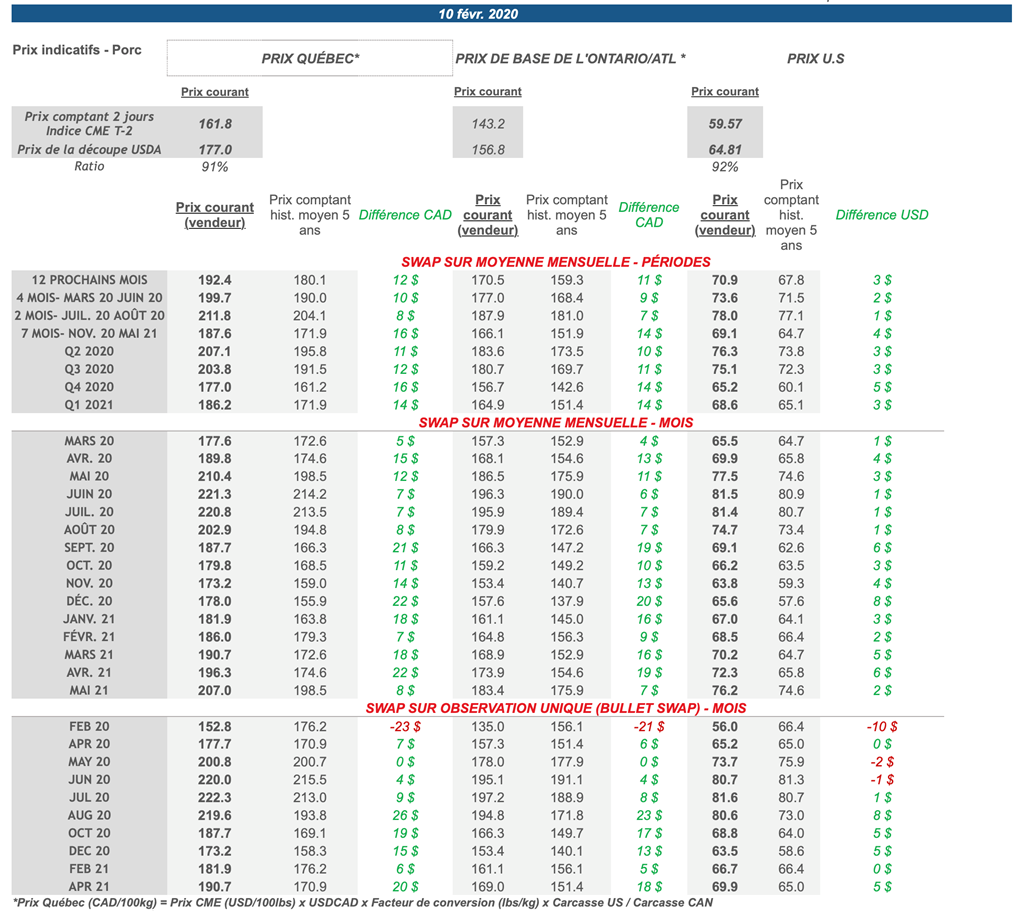 Voici les prix les plus récents sur le marché du porc et des grains: