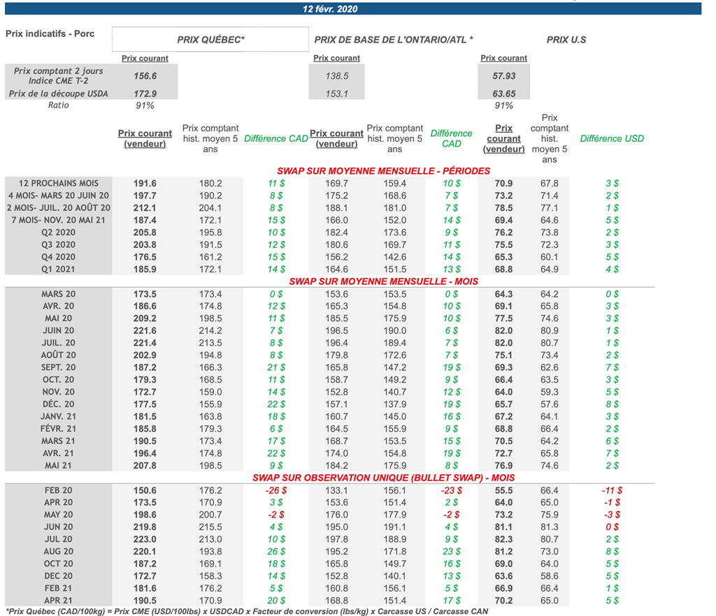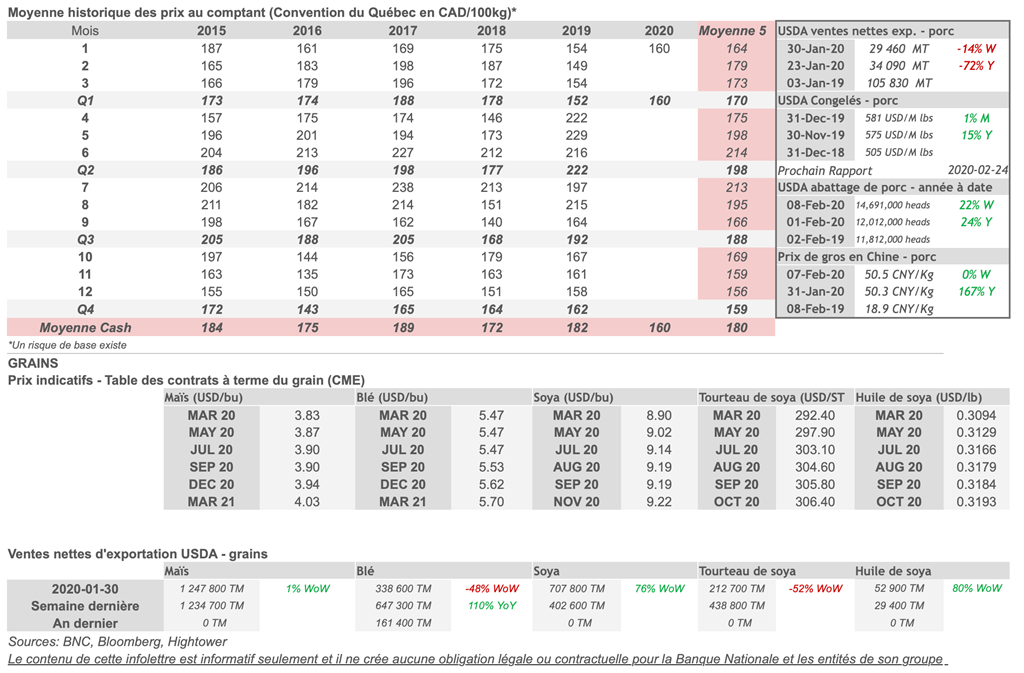 Voici les prix les plus récents sur le marché du porc et des grains: