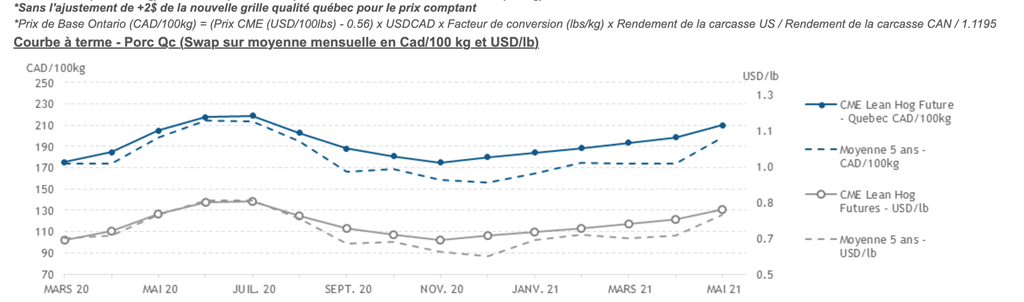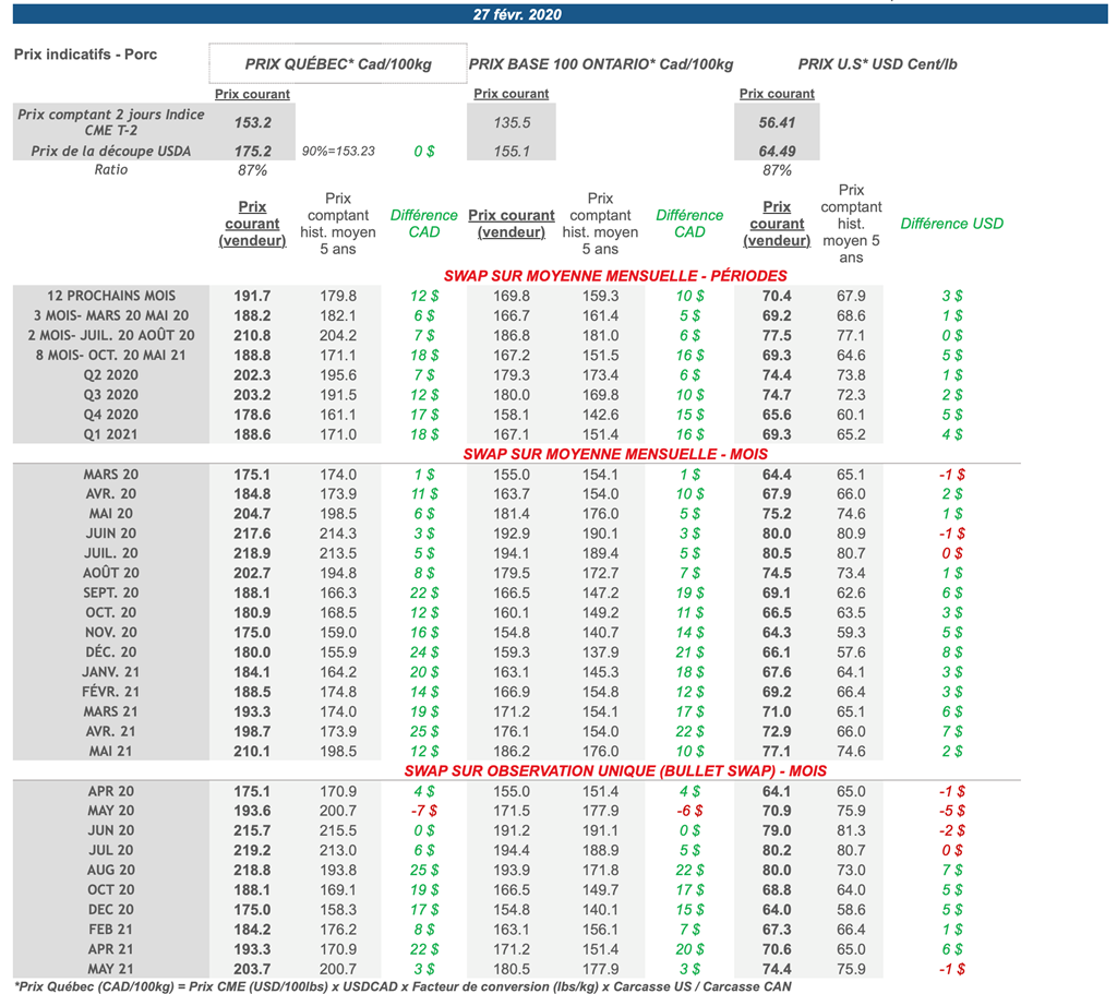 Voici les prix les plus récents sur le marché du porc et des grains: