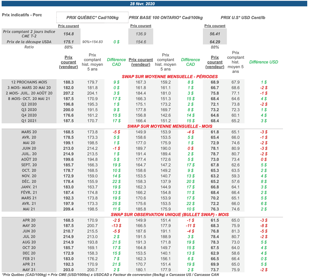 Voici les prix les plus récents sur le marché du porc et des grains: