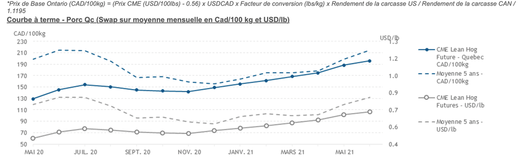 • La découpe de porc aux États-Unis a chuté à 59,21 USD cents/lb hier alors que le prix cash se situe à 64,46 USD/lb. L'épaule (butt) et le rôti d'épaule (picnic) ont terminé la journée à 73,22 et 43,28 USD cents/lb et ont perdu le plus, soit 21.28 (-22.5%) et 9.74 (-18.4%) respectivement.
