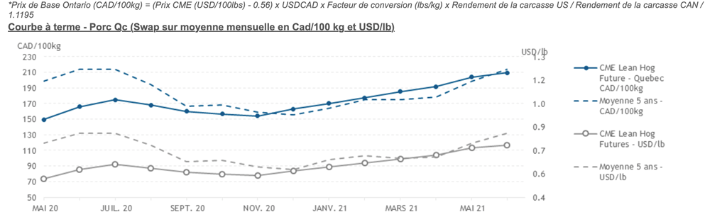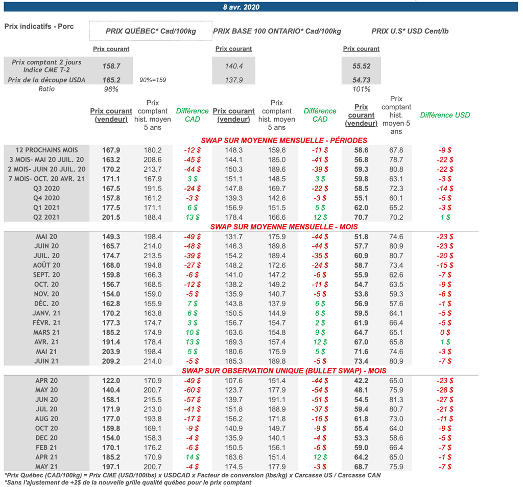 Voici les prix les plus récents sur le marché du porc et des grains: