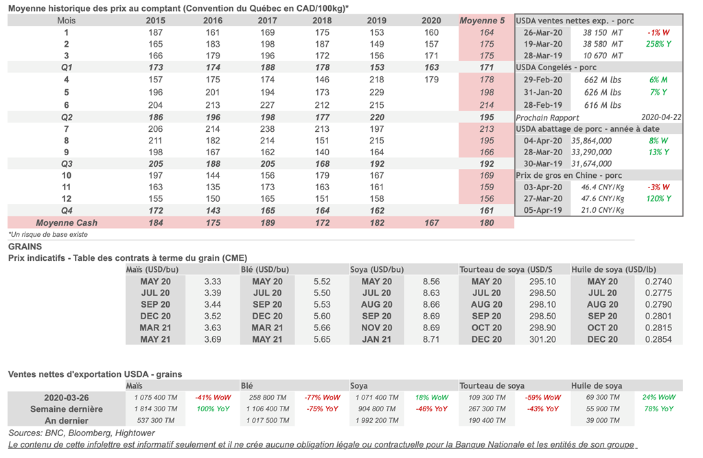 • 9 avril : USDA — Ventes nettes d’exportations pour les grains et le porc