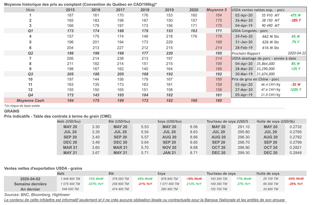 • Les marchés du porc et des grains seront fermés demain en raison du congé de Pâques.