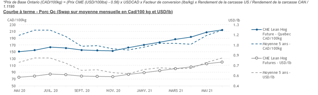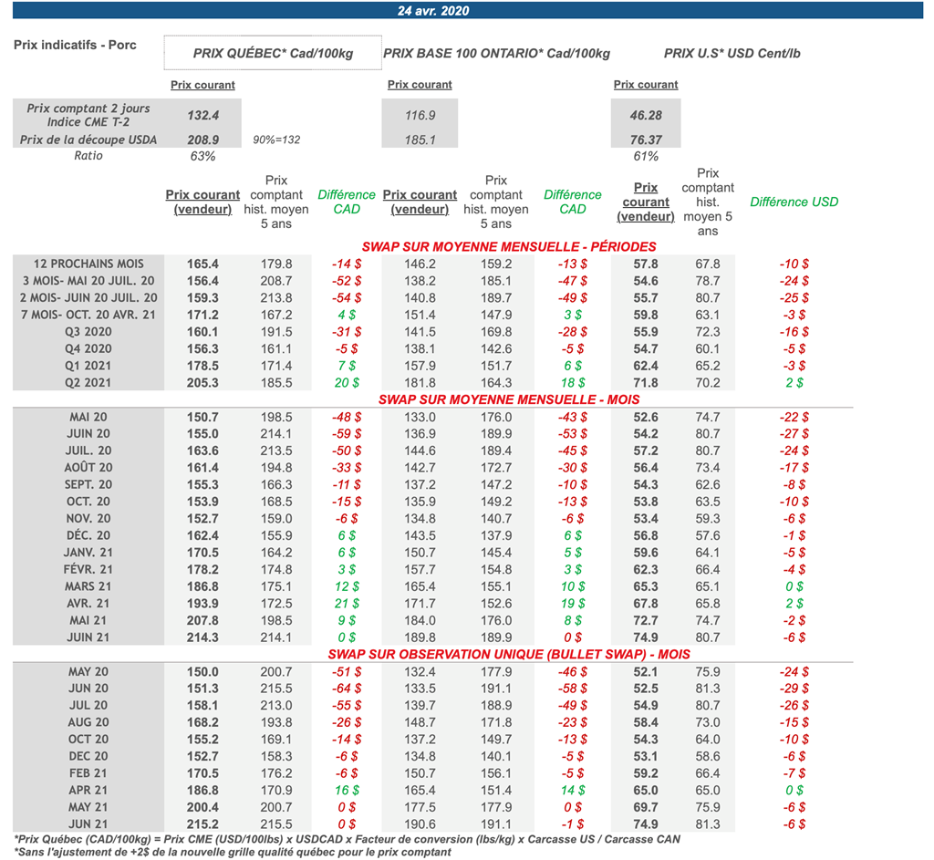 • Les prix des contrats de porc étaient en hausse hier pour toutes les échéances. Le contrat de mai 2020 a clôturé à 50,975 cents USD/lb, a atteignant le « limit-up » de 3,75 cents USD/lb (+7.94%). Le contrat de mai 2020 s’est d’ailleurs apprécié de 13,05 cents USD/lb (34,4%) depuis la fermeture des marchés vendredi dernier. Le prix contrat actif (juin 2020) suit la même tendance que celui du contrat de mai avec une hausse de 7,9 cents USD/lb (+18,1%) pour la même période.