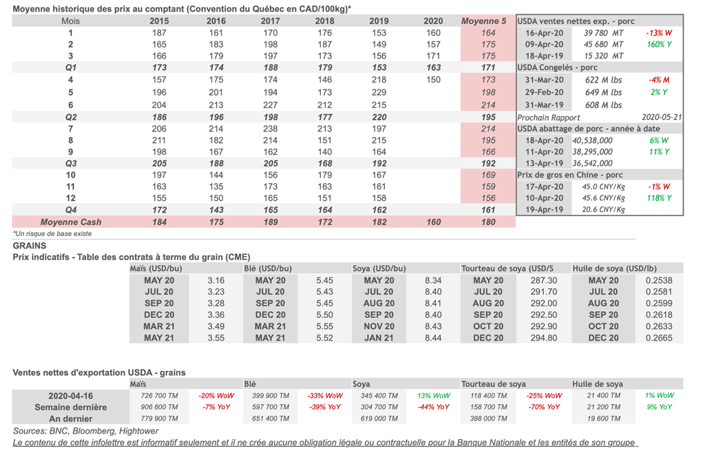 • La United Food & Commercial Workers estime que la fermeture d’abattoirs de porc aux États-Unis au cours des dernières semaines prive la chaîne d’approvisionnement de 25% de capacité d’abattage. L’organisation est également inquiète parce que 100 inspecteurs du département américain de l'Agriculture ont été testés positifs pour le coronavirus; certains de ces travailleurs qui font partie du Service de sécurité et d'inspection des aliments auraient visité des abattoirs où des cas de coronavirus ont été détectés avant de se rendre dans d’autres lieux d’abattage non infectés.