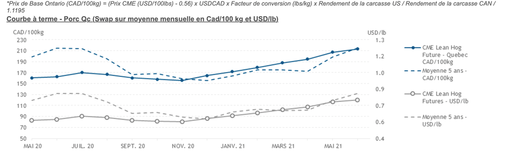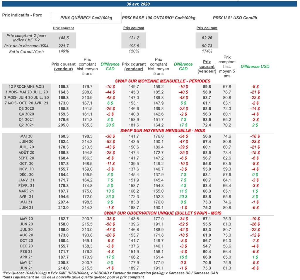 Voici les prix les plus récents sur le marché du porc et des grains: