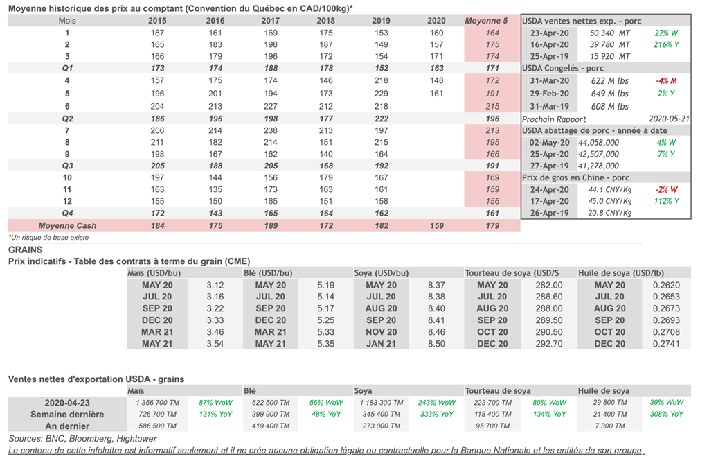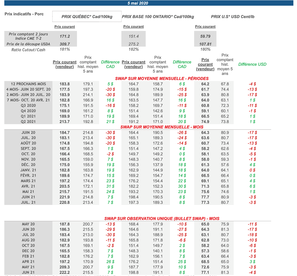 • Les contrats de porc étaient en hausse hier pour toutes les échéances sauf celle de mai 2021 qui a renversé en territoire négatif avant la fin de la session. Les contrats de mai et juin 2020 se sont particulièrement appréciés avec des gains de 4,85 (+7,71%) et 2,80 (+4,47%) cents USD/lb.