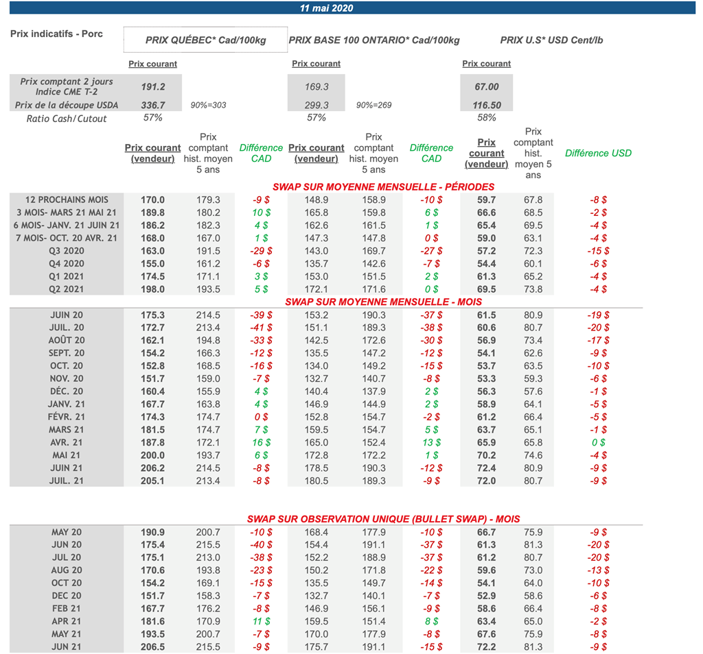 Voici les prix les plus récents sur le marché du porc et des grains: